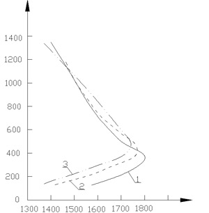 可见所用山西汾阳改良焦比北京普通焦发热量高出1845.27KJ/Kg,而与特级铸造焦的发热量相近似。焦炭固定碳含量增加,底焦在单位时间里所燃烧碳量增加,而导致炉内温度提高。如以炉内高温区最高温度(平均)表示,山西改良焦比北京普通焦将提高炉温60℃以上。焦炭固定碳含量对冲天炉炉内温度分布影响如图1所示。