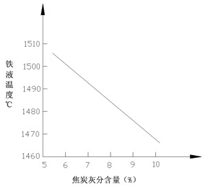随着焦炭灰分的降低,其炉温随之升高。焦炭灰分与铁液温度的关系为直线关系,灰分每减少1%,铁液温度提高10℃左右(见图2)。