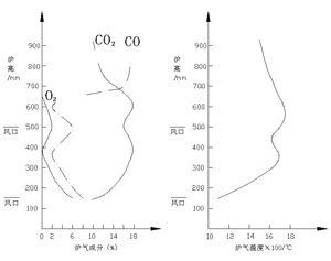 大双冲天炉的底焦试验表明。其底焦燃烧过程仍然是碳燃烧的4个基本反应,其不同之处在于如何组织燃烧。由于双排风口送风,排距拉长,在底焦中必然形成两个独立的燃烧区,每个燃烧区都形成自己的氧化带和还原带。这一现象可从炉衬侵蚀的状态得到证明。一排风口送风所形成还原带产生的CO,当上升到二排风口(即二排风口所形成的氧化带)遇氧再度燃烧。所以岂炉内温度沿炉身方向的分布特点与一般冲天炉不同,它具有两个温度峰值。随着上排风口进风量增加,底焦上部的炉温提高,从而使熔化带的位置上移,使铁液过热路程增加。参见图3。
