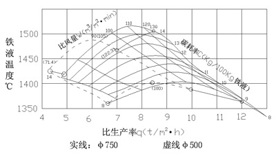 结构、焦炭质量和金属炉料状况一定的情况下,其炉子的熔化率和铁液温度主要取决于送风量和焦耗两的变动。其规律可用冲天炉网状图来表示,见图6(4)。